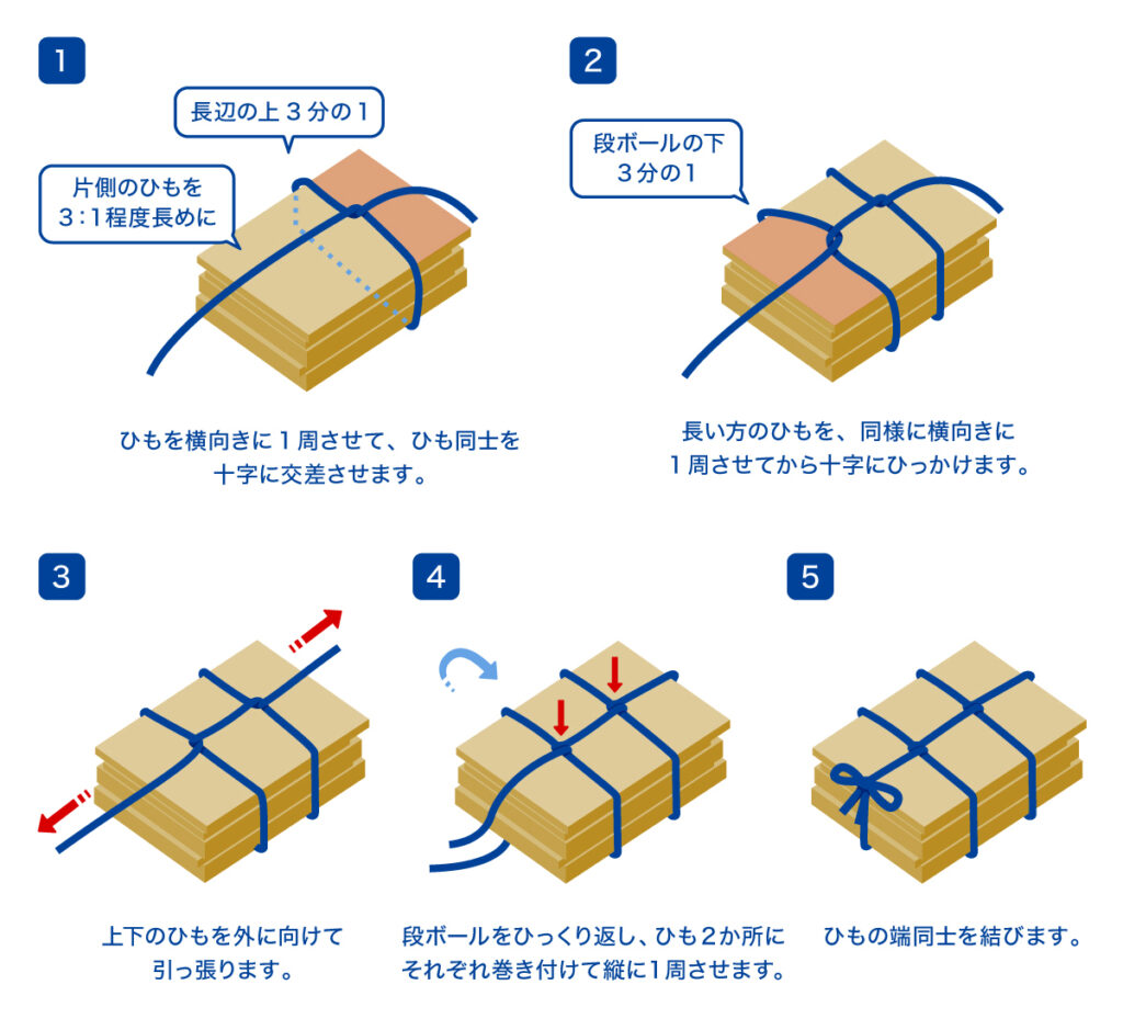 段ボールを紐で縛る方法には、主に以下の3種類があります。