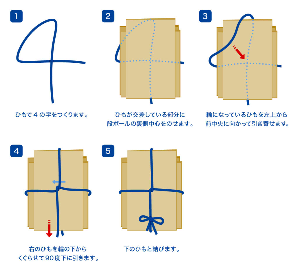 十字縛りは、段ボールの前面・背面に紐が十字になる、もっともシンプルな方法です。